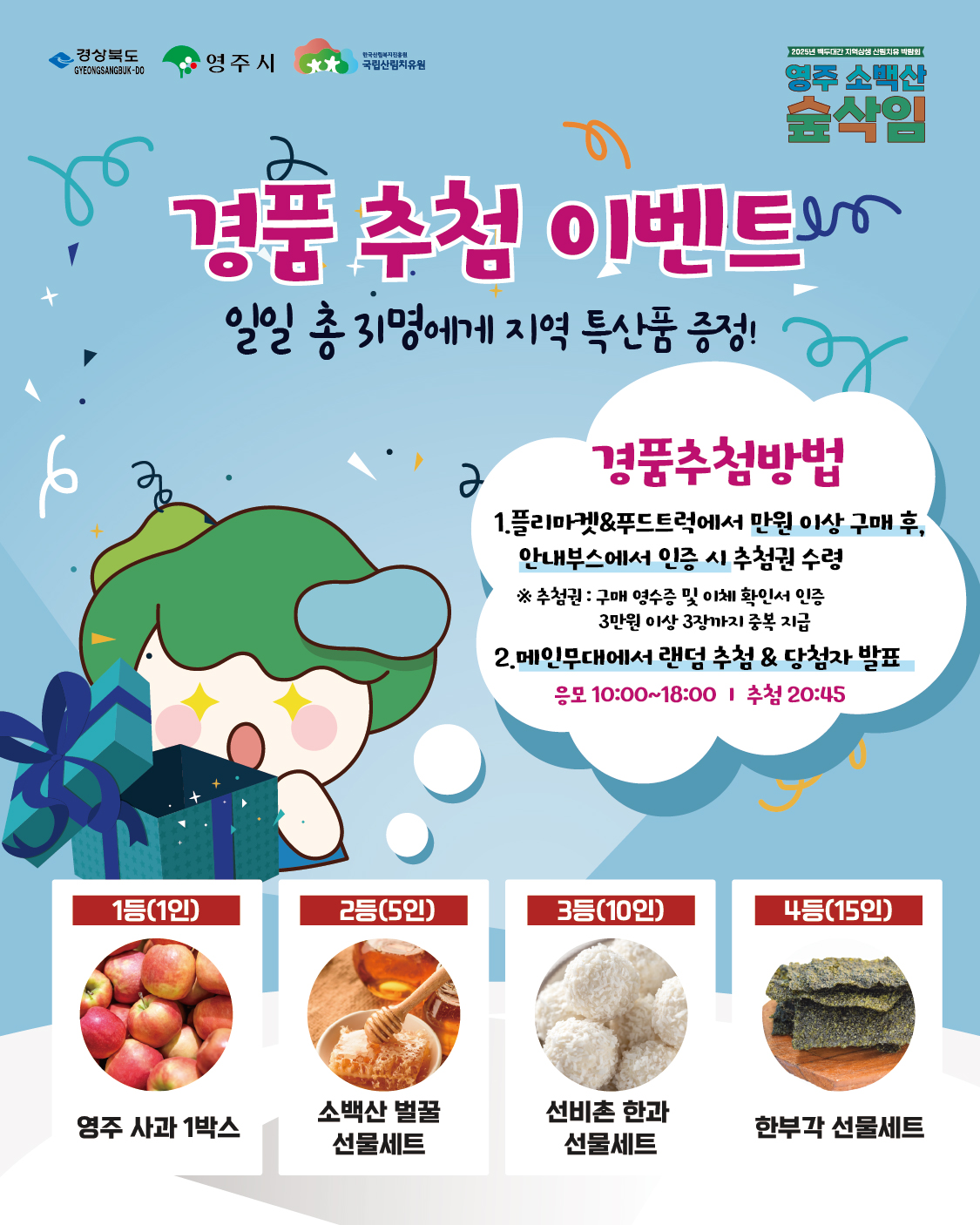 행사 기간 동안 영주 숲장터에서 물품을 구매하면, 하루 총 31명에게 지역 특산품을 증정하는 절호의 기회!!